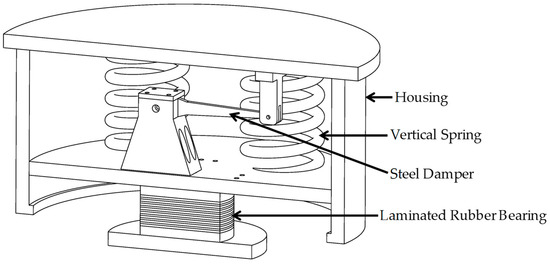 Figure 2 presents the operation concept of the 3D seismic isolator. Figure 2b shows the schematics of static vertical displacement condition due to dead weight of the super structure, and Figure 2c shows the horizontal and vertical displacement condition during earthquake events. The housing of the vertical seismic isolator transmits the horizontal load of the superstructure to the LRB and guides the vertical seismic movement. The dimension design of such a housing is determined according to the shape and dimensions of the vertical spring and steel dampers, which are determined according to the determination of the design VIF. The most important aspect in this design concept is that the housing should be designed so that interference with the LRB does not occur during the beyond-design-basis earthquakes. To do this, the vertical seismic displacement of the spring should be properly limited by the determination of a design VIF and damper design.