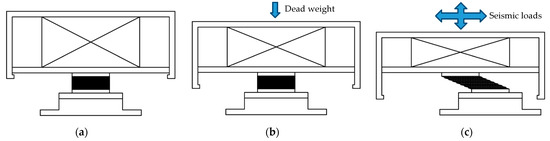 Schematics of 3D seismic isolator’s motions: (a) Without loads; (b) with vertical static load; (c) with horizontal and vertical seismic loads.