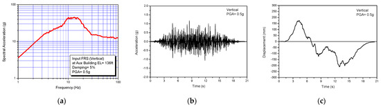 Used vertical seismic input motion (PGA = 0.5 g): (a) Floor response spectrum; (b) acceleration time history; (c) displacement time history.
