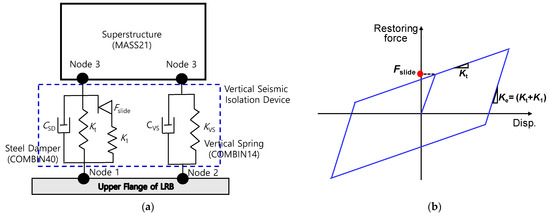 Figure 4 presents the simple seismic analysis model used for the sensitivity of the vertical seismic isolation performance on the VIF. For the transient seismic time history analysis, a commercial finite element program ANSYS [23] was used. As shown in Figure 4a, the vertical spring is modeled by a simple stiffness–damping element (COMBIN14), and the vertical damper is model with a bilinear force–displacement element (COMBIN40), reflecting the hysteretic characteristics of the steel damper. It was assumed that the inertia mass of the superstructure acts as a concentrated mass (MASS21) at node 3. Figure 4b shows the concept of the bilinear model of the steel damper.