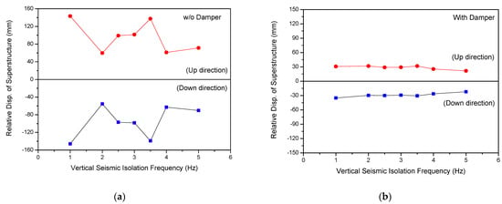 Figure 6 shows the maximum vertical spring displacement response according to the design VIF. As shown in Figure 6a, when only a vertical spring is used without using a steel damper, the vertical spring displacement becomes very large (e.g., 101.3 mm when VIF = 3 Hz). Therefore, it is not possible to design a vertical seismic isolation device actually accommodating the LRB dimensions in Table 1. When the steel damper with the design characteristics of Table 3 is used, the vertical spring displacement can be significantly reduced to 30 mm or less, as shown in Figure 6b.