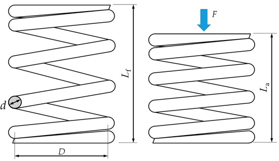 In this study, a helical coil spring, which is widely used in industry, was selected as another spring type to provide vertical stiffness. The main design variables that determine the stiffness characteristics of a helical coil spring are the coil diameter, section diameter, and number of turns, as shown in Figure 9.