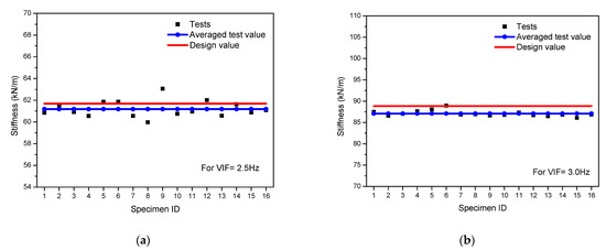Comparison of stiffness between tests and design values of helical coil springs: (a) For VIF = 2.5 Hz; (b) for VIF = 3.0 Hz.
