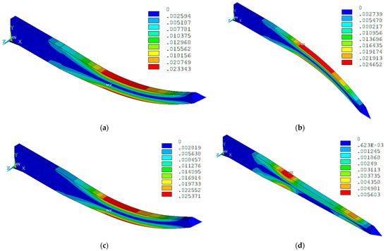 Analysis results of equivalent plastic strain distributions and deformation shapes of steel damper, SD2 during ±30 mm stroke: (a) After 1/4 cycle; (b) after 1(3/4) cycles; (c) after 3(1/4); (d) after 5 cycles.
