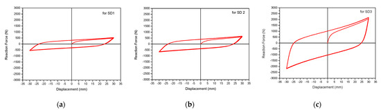 Figure 15 presents the analysis results of hysteretic behavior for five cycles, which is the vertical displacement–reaction force relationship of the steel damper. As shown in the figure, the effective stiffness increases in order of SD1, SD2, and SD3, and energy dissipation area increases inversely, and it can be seen that all shapes of steel dampers exhibit hysteretic behavior in which all isotropic hardening properties are quickly stabilized after about three cycles.
