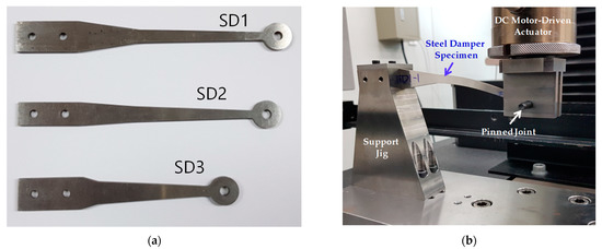 The quasistatic test was performed to verify the hysteretic damping performance of the steel dampers in Table 11. In the verification test, three specimens were used for each steel damper ID. Figure 16 is a photograph of the steel damper specimen shapes and test facility with installation of the steel damper specimen. Table 12 shows the specifications of the DC motor-driven testing machine used in this test.