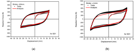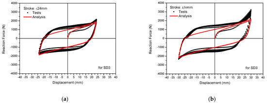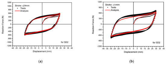 Comparison results of hysteretic behavior between tests and analyses for steel damper, SD2: (a) for ±24 mm stroke; (b) for ±30 mm stroke.