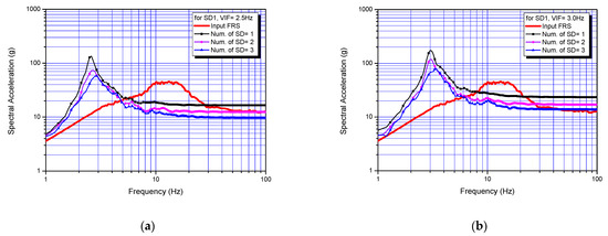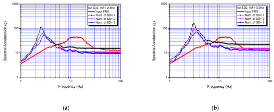 Results of vertical response spectrum for steel damper, SD2: (a) Design VIF = 2.5 Hz; (b) design VIF = 3.0 Hz.