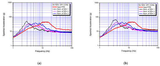 Results of vertical response spectrum for steel damper, SD3: (a) Design VIF = 2.5 Hz; (b) design VIF = 3.0 Hz.