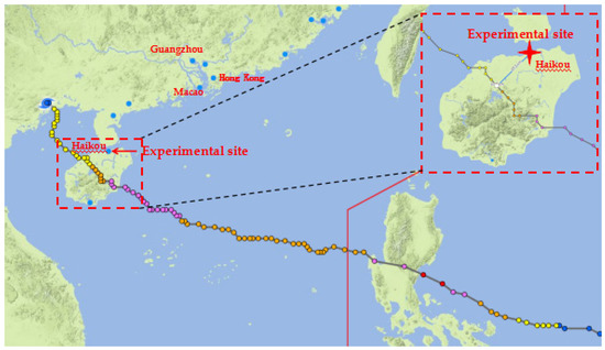 As reported by China Meteorological Administration (http://www.cma.gov.cn/), Typhoon Sarika formed as a tropical depression over the western North Pacific Ocean to the east of the Philippines on 12 October 2016, and landed on the eastern coast of Luzon Island, Philippines at 2:20 on 16 October 2016, reaching its peak intensity with the maximum magnitude wind of 16 (55 m/s) near its centre and with a minimum air pressure of 930 hPa. After moving westward rapidly across the northern part of the South China Sea for two days, Sarika made landfall along the coast of Hele Town of Wanning city, Hainan Province at 9:50 on 18 October 2016, with a maximum magnitude wind of 14 (45 m/s) near its centre and with a minimum air pressure of 955 hPa. The typhoon Sarika, which decayed rapidly on 19 October at 17:00, made its final landfall over the coastline and border of Vietnam and China. The moving track of Sarika and the ambient condition of the experimental site is presented in Figure 1.