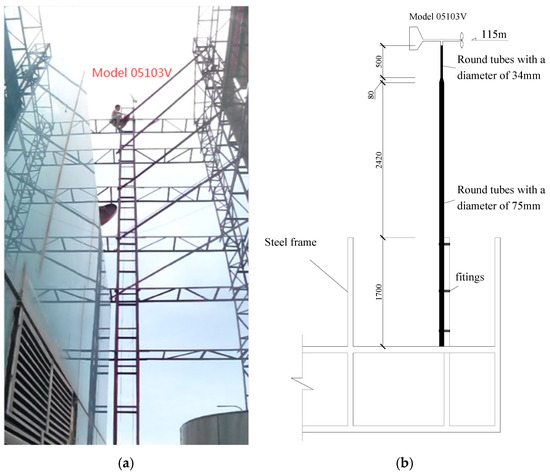 Installation location of Model 05103V anemometer. (a) Installation drawing of anemometer; (b) Installation detail drawing.