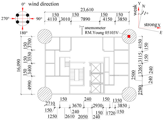 The time histories of wind speed and wind direction are all collected by the monitoring system (Model uT33) produced by Wuhan uTekL Electronic Technology Co., Ltd. (Wuhan, China) with a sampling frequency of 128 Hz. Figure 3 shows the installation location of Model 05103V anemometer at a height of 115 m, the instantaneous wind speed is recorded by the mechanical anemometer with the maximum measurement capacity of 100.00 m/s. Figure 4 shows the plan of installation position of 05103V anemometer on the roof of high-rise building, the 0 direction of the anemometer is parallel to the y-axis and refers to North by West 11°, and the 90°of the anemometer represents the measured wind direction parallel to the x-axis, and the designation of other angles follows the clockwise rule.