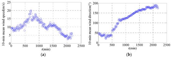 The 36.7 h wind field data collected at 23:00 on 17 October 2016 and is used to record the wind speed and direction during the passage of Typhoon Sarika. The measured maximum instantaneous wind speed is 34.84 m/s. Before the landing of Typhoon Sarika, the wind direction varies greatly and appears to be unstable, while it shifts about 180° during the passage of Typhoon Sarika, namely the wind direction shifts almost from south to north. During the most muscular landing passage of Typhoon Sarika, the wind direction varies in the range of 70~110°. Figure 6 shows the 10-min mean wind speed and direction variations during the passage of Typhoon Sarika, the peak of 10-min mean wind speed is about 20.02 m/s and the 10-min mean wind direction is from 0° to 180°.
