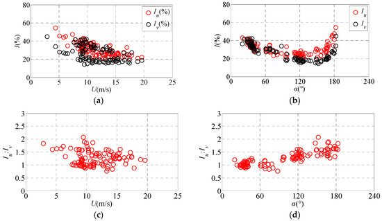 In summary, the turbulence intensity of fluctuating wind closely relates to the ambient condition disturbance and terrain roughness categories. The measured turbulence intensity in the inflow-wind area is the lowest when terrain roughness is category A. Turbulence intensity decreases with the increasing mean wind speed in the same terrain roughness categories, and the longitudinal turbulence intensity are generally more significant than lateral turbulence intensities. Figure 7c shows that the ratios of the standard deviations between the turbulence components (Iu:Iv) obtained by the anemometers are relatively stable when the 10-min mean wind speed is higher than 10 m/s, and the averaged value of ratio between turbulence components (Iu:Iv) is 1.34 during the passage of Typhoon Sarika.