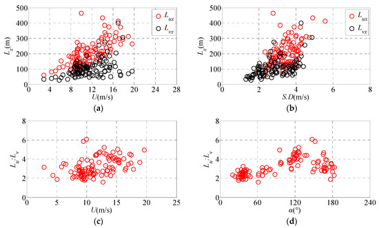 where is mean wind speed; and are the standard deviation and auto-correlation function of the longitudinal and lateral fluctuating velocity components u and v, respectively. To get a more consistent estimate of the integral scale, the auto-correlation function is integrated until the correlation drops to 0.05 and Taylor’s hypothesis is used to convert the integral time scale to the integral length scale. Equation (8) shows that the turbulence integral scale is closely related to mean wind speed and the standard deviation of S.D of fluctuating wind. Therefore, the rules of turbulence integral scale concerning the mean wind speed and S.D of fluctuating wind are significant. Figure 8a,b shows the variations of the measured longitudinal and lateral turbulence integral scales with respect to the mean wind speeds and S.D of fluctuating wind with a 10-min interval. The results show that the measured turbulence integral scale is basically in the range of 0–200 m when the 10 min mean wind speed is less than 8 m/s, while the measured turbulence integral scale is basically in the range of 200–500 m when the 10 min mean wind speed is within 8–21 m/s, Figure 8a,b shows that the measured longitudinal and lateral turbulence integral scales increase with the increasing mean wind speed and S.D of fluctuating wind, which shows that the turbulence integral scales are positively correlated with the intensity of inflow wind.