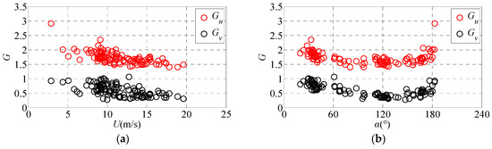 Figure 8c,d shows the ratios of the turbulence scale between the turbulence components (:) with respect to the mean wind speed and wind direction, : are basically within 2~4 under the excitation of static wind, and : are within of 4~7 if the 10 min wind speeds are higher than 10 m/s, which explains that : increases with the increasing mean wind speed, and further discloses that the increasing mean wind speed has greater influence on longitudinal turbulence integral scales than that on lateral turbulence integral scales.