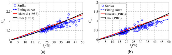 where T is a different sample duration. Ishizaki suggested k1 = 0.5, k2 = 1.0; Equation (10) shows that the main factors of gust factors are turbulence intensity, sample duration, and gust duration. Taking = 3 s and T = 10 min as example, Equation (10) is adopted to fit the relationship between gust factor and turbulence intensity during the passage of Typhoon Sarika, and to compare with the linear model proposed by Ishizaki [14] Figure 10 demonstrates that the gust factor increases with the increasing turbulence intensity, and shows a linear relationship between turbulence intensity and gust factor. The results show that the prediction values of the linear model proposed by Ishizaki [14] are larger than the measured values. Based on the measured values of longitudinal and lateral gust factors and turbulence intensity during Typhoon Sarika, an empirical formula concerning longitudinal and lateral gust factor and turbulence intensity are proposed: