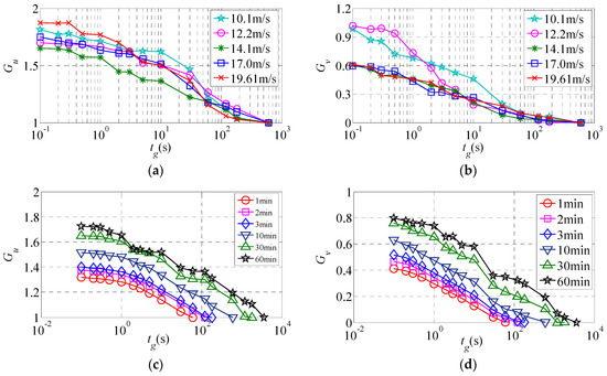 The variation of gust factors obtained at different sample duration and gust duration. (a) Gu with respect to tg; (b) Gv with respect to tg; (c) Gu with respect to T; (d) Gv with respect to T.