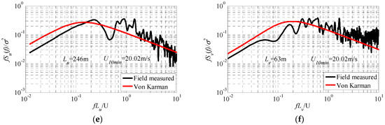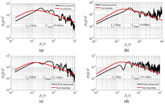 where and are the standard deviations of fluctuating wind in the longitudinal and lateral direction, respectively; and and are the integral scales of fluctuating wind in longitudinal and lateral directions, respectively. The values Xu and Xv are the dimensionless frequency of fluctuating wind in longitudinal and lateral directions, respectively. In this study, power spectrum of wind speeds of sample duration at 10-min mean wind speed of 9.09 m/s, 15.14 m/s, and 20.02 m/s are analyzed. Figure 12a–d shows that the Von Karman-type spectrum was consistent with the predicted value of the measured fluctuating wind power spectrum in longitudinal and lateral directions. The Von Karman-type spectrum has a slightly higher prediction of the longitudinal power spectrum of wind speeds when Xu in the range of 10−2–10−1. Moreover, the measured longitudinal power spectrum of wind speeds decays faster than the lateral power spectrum of wind speeds, and the Von Karman-type spectrum has a slightly higher prediction of the longitudinal power spectrum of wind speeds when Xu is in the range of 10−1~101.