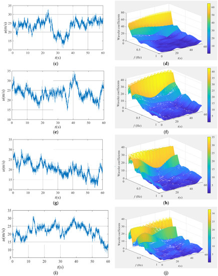 Wavelet time-frequency diagram of five 1-min subsamples. (a) Wind speed sample of No. 1; (b) Wavelet time-frequency diagram of No. 1; (c) Wind speed sample of No. 2; (d) Wavelet time-frequency diagram of No. 2; (e) Wind speed sample of No. 3; (f) Wavelet time-frequency diagram of No. 3; (g) Wind speed sample of No. 4; (h) Wavelet time-frequency diagram of No. 4; (i) Wind speed sample of No. 5; (j) Wavelet time-frequency diagram of No. 5.