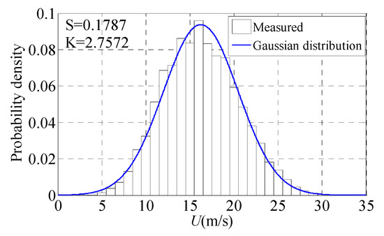 In Equations (16) and (17), n is the sample size, is the sample mean, and is the sample standard deviation. This paper discusses whether the probability density of wind speed in the whole process of typhoon landing conforms to Gaussian distribution. Figure 14 shows the probability density of total samples in the entire landing process of Typhoon Sarika. The skewness coefficient is 0.1787 and the kurtosis coefficient is 2.7572 during the landing process of Sarika. Criteria of and are used for judging whether the probability density of the sample follow a Gaussian distribution. Therefore, the wind speed samples follow the Gaussian distribution during the landing process of Typhoon Sarika.