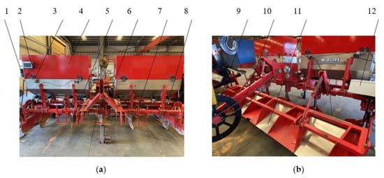 The mechanical structure diagram of variable formula fertilizer. If there are multiple panels, they should be listed as: (a) Forward graph; (b) Backward graph. (1) Servo motor, (2) Vehicle-mounted control terminal, (3) Pressure sensor, (4) Fertilizer tank, (5) Soil plow, (6) Suspension mechanism, (7) Frame, (8) Trough wheel type fertilizer device, (9) Speed sensor, (10) Ground wheel, (11) Plastic device, (12) Programmable Logic Controller (PLC controller).