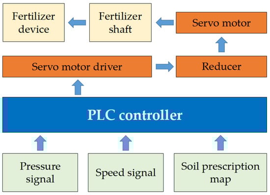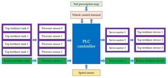 The variable formula fertilization control system based on the prescription map is mainly composed of pressure sensors, speed sensors, servo motors, fertilization actuators, PLC controllers, and vehicle control terminals. The overall design structure is shown in Figure 2. The modules of the system work according to the pre-established communication protocol. The pressure sensor combines the fertilizer weight detection signal and the speed sensor to the ground wheel speed detection signal, which are quickly collected by the PLC controller, filtered, scaled, and non-linearly corrected. It is transmitted to the vehicle control terminal for display, combined with the feedback data information of the soil prescription diagram, and the formula fertilization control strategy and instructions are obtained through calculation. It sends to the PLC controller to execute commands to control the speed of the servo motor and realize the function of variable formula fertilization.