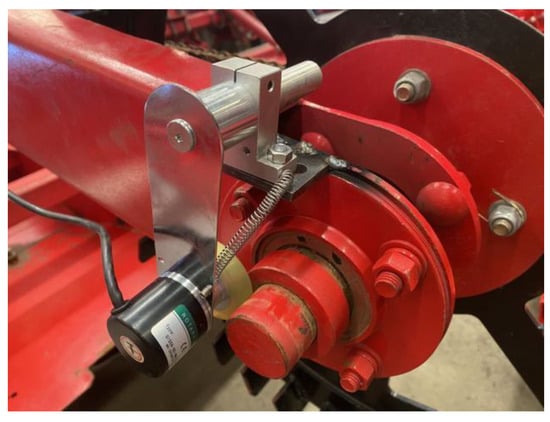 The forward speed of the cultivating fertilizer applicator is an important detection parameter of variable formula fertilization []. In this study, the incremental rotary encoder (AB two-phase, 100 pulses) produced by JTS encoder is selected. It has strong anti-interference and high cost performance, and it is installed on the ground wheel of the test prototype (as shown in Figure 3).
