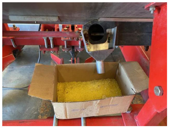 In order to achieve the purpose of precise fertilization, it was necessary to determine the discharge capacity of different fertilizer dispensers [,]. The test materials were commonly used granular fertilizers: urea (N), diammonium phosphate (P), and potassium sulfate (K). Before the test, the fertilizer was put into the fertilizer tank, and the servo motor was controlled through the PLC controller. It drove the trough wheel type fertilizer discharging device to rotate at a certain speed and put the material receiving container at the fertilization outlet. The fertilizer amount could be obtained by weighing the weight of the fertilizer in the receiving vessel. Then, a stopwatch was used to time the fertilizer discharge. The test was repeated 3 times for each fertilizer device at each speed. The test results are shown in Table 2 and fertilizer discharge measurement test is shown in Figure 8.