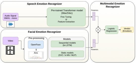 Our framework is composed of two systems: the speech emotion recognizer and the facial emotion recognizer. We combined the results of these two systems with a late fusion strategy, as we can see in the diagram of Figure 1.