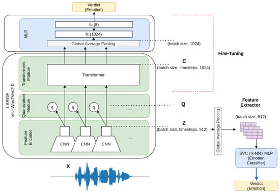 In Figure 2, we show a diagram that clarifies the feature extractor and the fine-tuning strategies. Under the square of ‘LARGE xlsr-Wav2Vec2.0’, we can see in green the default layers that the model had. From the output of the feature encoder stage, we extracted the embeddings that we fed to the static models (SVM, k-NN, and MLP). Regarding the fine-tuning version, the pink lines indicate the layers we re-trained with RAVDESS. Inside the blue box, we can also identify the added layers on top of the transformer for performing emotion classification.