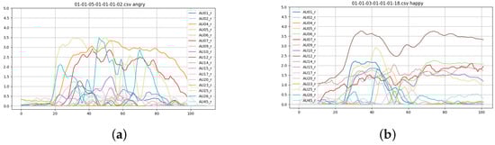 Plots of the 18 AUs generated by the OpenFace library [71] for the intensity version ranging from 0 to 5 of two videos of the RAVDESS dataset. (a) AUs’ intensities for an angry sample; (b) AUs’ intensities for a happy sample.