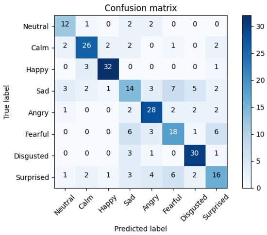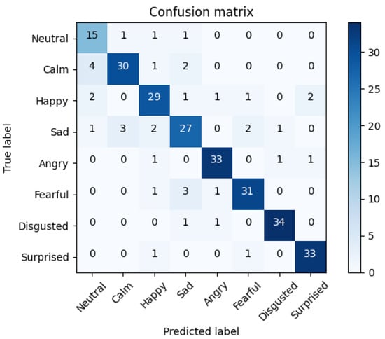 However, feature engineering required large amounts of time to create and decide which descriptors were the most suitable for solving a specific task. As an attempt to reduce the researchers’ efforts, some frameworks emerged to obtain these hand-crafted features automatically, such as OpenSmile [30] or Praat [31]. Bhavan et al.’s [32] work was an example of this traditional line of investigation that employed desciptors. They passed MFCCs and spectral centroids to a bagged ensemble of support vector machines, giving an overall accuracy of 72.91% for RAVDESS.