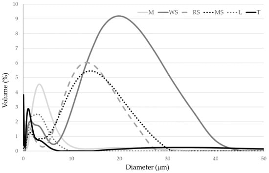 | D (4,3) (µm) | 69.2 (0.23) d | 27.4 (2.77) c | 6.4 (0.07) a | 16.7 (0.00) b | 107.5 (7.00) e | 231.7 (1.50) f |