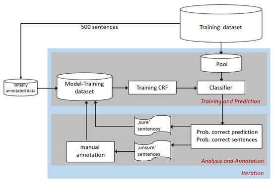 Named entity recognition (NER) constitutes an important step in the processing of unstructured text content for the extraction of information as well as for the computer-supported analysis of large amounts of digital data via machine learning methods. However, NER often relies on domain-specific knowledge, being conducted manually in a time- and human-resource-intensive process. These can be reduced with statistical models performing NER automatically. The current work investigates whether Conditional Random Fields (CRF) can be efficiently trained for NER in German texts, by means of an iterative procedure combining self-learning with a manual annotation–active learning–component. The training dataset increases continuously with the iterative procedure. Whilst self-learning did not markedly improve the performance of the CRF for NER, the manual annotation of sentences with the lowest probability of correct prediction clearly improved the model F1-score and simultaneously reduced the amount of manual annotation required to train the model. A model with an F1-score of 0.885 was able to be trained in 11.4 h.