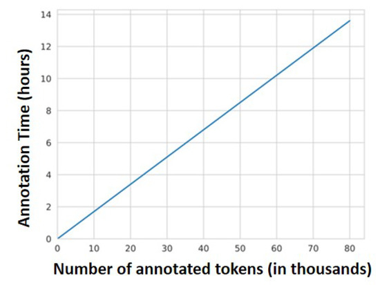 Estimation of the annotation time as a function of the number of tokens annotated.