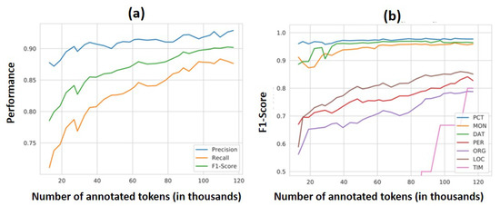 The comparatively lower performance of the model in recognising entities from the ENAMEX group can be attributed to the higher diversity of these entities in natural language usage than for entities from the NUMEX and TIMEX groups. NUMEX and TIMEX entities tend to have standard formats that can be well-estimated via regular expressions, whereas ENAMEX entities can be comprised of a vast, indeed nearly limitless, number of combinations of words, (invented) names, or acronyms. Thus, our results agree with previous reports of reduced vocabulary transfer of entities of the ENAMEX group, especially for persons and organisations [7,28,29]. Some regular expressions, such as the acronym GmbH for proprietary limited companies, can be used to identify entities in the German language, but not all entities can be identified using such expressions and not all texts relating to such an entity use the appropriate acronym. The poor performance of the reference experimental model at recognising the TIMEX entities after a large number of annotated tokens can be attributed to its rare occurrence in the data: in the evaluation dataset, only twelve instances were manually annotated.