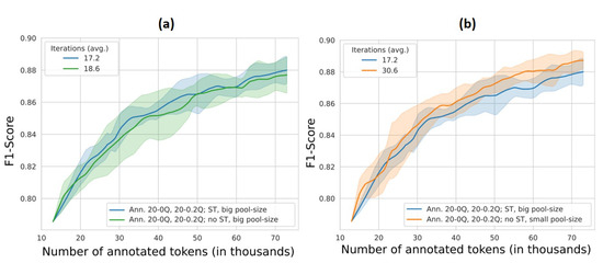In the experiments with only self-training or active learning, the size of the pool was comparatively smaller than in experiments with both components, as less sentences were added to the model training data in each iteration step. This was particularly the case for the experiment without self-training compared with the experiment with self-training, as the majority of added sentences in each iteration were derived from the self-training component during model training. In order to assess the effects of the comparative reduction in the model training dataset as a result of the omission of self-training on the model performance, we performed an experiment without self-training and with an adjusted pool size. The pool size in this experiment was set to the pool size in a comparable experiment with self-training, but only manual annotation was performed (‘Ann. 20-0Q, 20-0.2Q, no ST, large pool-size’, Table 3). In a further experiment, we retained the pool size at a constant 400 sentences (i.e., 10 times the number of sentences annotated and added to the model training data) per iteration (‘Ann. 20-0Q, 20-0.2Q, no ST, small pool-size’, Table 3).
