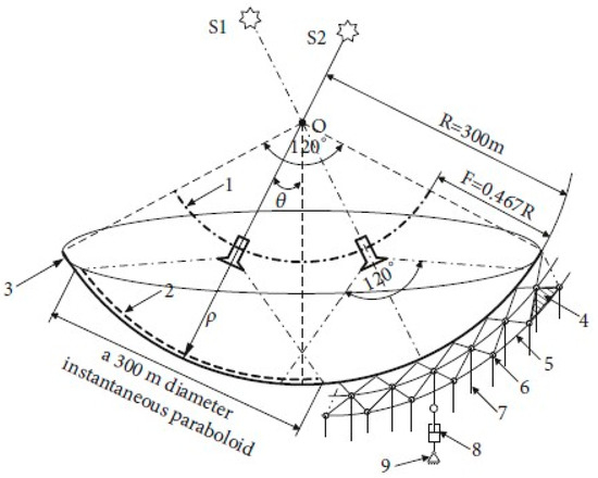 Different from cable-net structures in the general architectural field, FAST has a particular use function as an astronomical radio telescope. Playing the most crucial role in FAST displacement, the cable net has an ultralong span and flexible shape. Its active reflector state includes two main parts: (1) The basic spherical state. The supporting structure of the FAST active reflector is subject to its own weight (including the weight of the back frame structure and the cable-net structure) and pre-stressing force. The main cable-net nodes are in the equilibrium state on the designated reference sphere, which is the basic spherical state. (2) Active displacement working state. In order to meet the needs of astronomers for observing celestial bodies in different directions and distances, FAST needs to form paraboloids of various calibres at particular angles, and this function is achieved by the actuators dragging the pull-down cables (See Figure 2) [6,7].