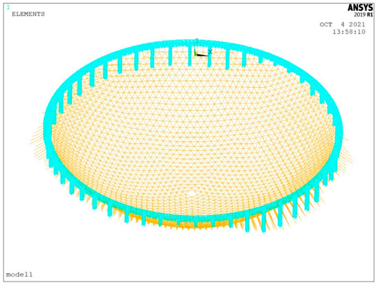 ANSYS Parametric Design Language (APDL) is an advanced application of ANSYS that is widely used in engineering projects and has a powerful programming capability. It is beneficial to use APDL in establishing the MST model. The complete ANSYS model of the cable net, including cables, beams, and columns, is shown in Figure 3.