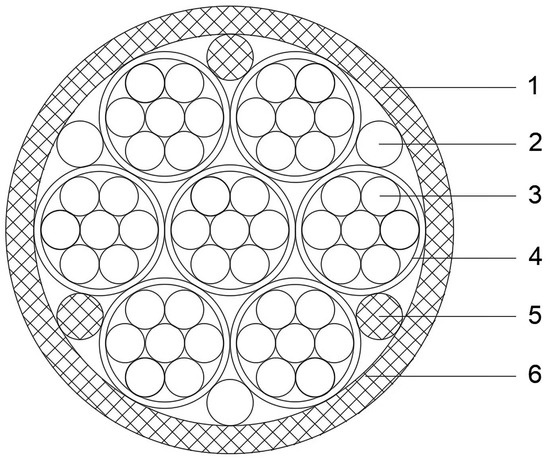 Sectional view of finished FAST cables. 1: Outer HDPE; 2: galvanized steel wire; 3: epoxy-coated steel strand; 4: inner HDPE; 5: stuffing rope; 6: high-strength polyester tape.