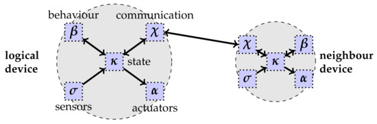 Usually, the approach is implemented through repeated computation of the self-organising logic in asynchronous rounds (although some models promote reactivity [31]), interwoven by exchanges of the information processed locally with devices considered to be logical neighbours. Devices can be neighbours because of the physical structure of the network (e.g., because they are communicating through a direct channel, such as a managed Wi-Fi network), or, more commonly, because of a logical network layer. In principle, the programming model takes no stance on the nature of a device: it could be a piece of hardware as well as a digital twin corresponding to some situated physical device. The consequence of this flexibility has been partly explored in [11], where different architectural deployments, with very diverse performance and cost profiles, are shown to be viable when implementing the “digital thread” (synchronising sensor readings from physical sensors to digital twins, forwarding actuation commands to physical twins, and dealing with the network required to enable logical interaction).