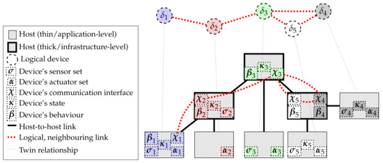 Our proposal differs from related work for it provides an integrated approach that considers: (i) a meta-model where logical entities are decoupled from physical entities (see Section 4 for details)—like in [32,33]; (ii) a distinction between identity and execution relationships, allowing to distinguish between digital twins and virtual devices; and (iii) a collective computing approach whereby the focus is on collective-level behaviour, rather than individual behaviour (so, e.g., we do not assume behavioural differences between digital twins and virtual devices).