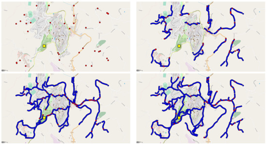 We implemented the route-tracing program in the Protelis aggregate programming language [49], and we leveraged the Alchemist simulator [50] to model the environment and the devices’ movements. Data for the road infrastructure have been extracted from OpenStreetMap (OSM) [51], as Alchemist provides native support for route computation and navigation within these maps.