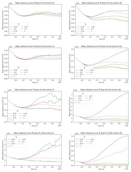 From Figure 6, we see that the system has an initial stabilisation phase: initially, explorers can hardly communicate with each other, and with time, through the generation of virtual devices, the virtual communication network gets closer and closer to the shape of the actual communication routes. We can see that the larger is the count of explorers, the shorter is the time required for the system to stabilise (as more roads get explored more quickly). We note however that in some cases the system error, after a period of reduction, grows out of control. This phenomenon occurs in particular when , and when and , and it is typically coupled with an erratic behaviour of the error. We believe that this effect is due to the logical network no longer mapping the underlying physical infrastructure correctly: virtual devices become too sparse and their connection range too large, the virtual network infrastructure that they build grows further and further different from the curvy structure of the Medieval roads that make the city centre. In some cases, a device placed in an unexplored area may lead to an improvement in the distance error, yet normally there is a high chance that its reification may cause the creation of a non-existing passage between two locations.