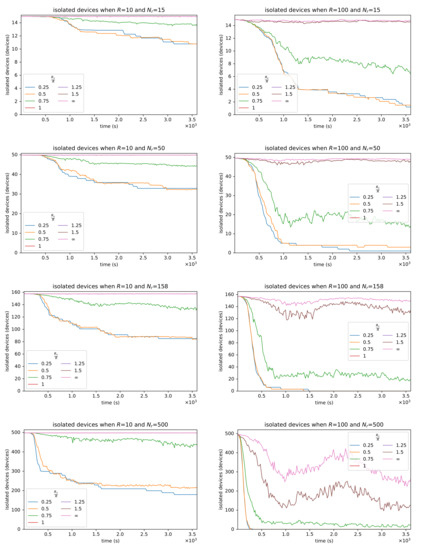 By observing Figure 7, we can further appreciate how a larger count of explorers helps to reach stability faster. Interestingly, even with reasonably short values for R (e.g., R = 100 m), the system shows a pretty high reachability (the lower the count of isolated devices, the higher the reachability). As expected, for any given value of R, the more virtual devices get generated, the higher is the reachability.