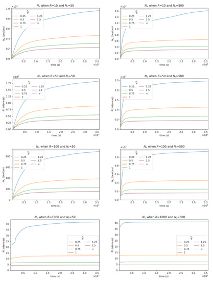 - Relative spawn range: the ratio between and R. As mentioned when discussing the set of values selected for , the ratio provides more insightful information than modifying R and independently. Since initial testing showed that both values of close to 0 and values much higher than 1 produced respective situations with a gigantic cost and poor performance and results akin to those of , we decided to use a linear range of six samples between and , plus the special value ∞ that entirely disables the generation of virtual devices.