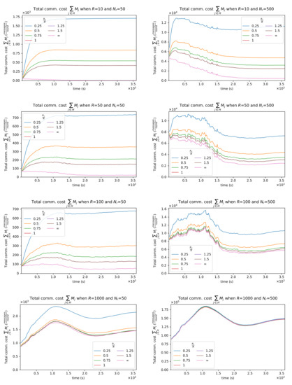 - communication cost, defined, for each physical device with id , as the occupied dimension of the buffer for received messages normalized by the size of the last message sent—in other words, it measures how many messages, produced either by real or virtual devices, have been received by the real node with id j. Higher values indicate more stress on the network capacity. Since messages require processing, if the behaviour component of pulverised devices is executed on physical devices (as it is likely in the case of “thick” end devices, such as modern smartphones), then this metric also correlates with higher battery energy consumption.