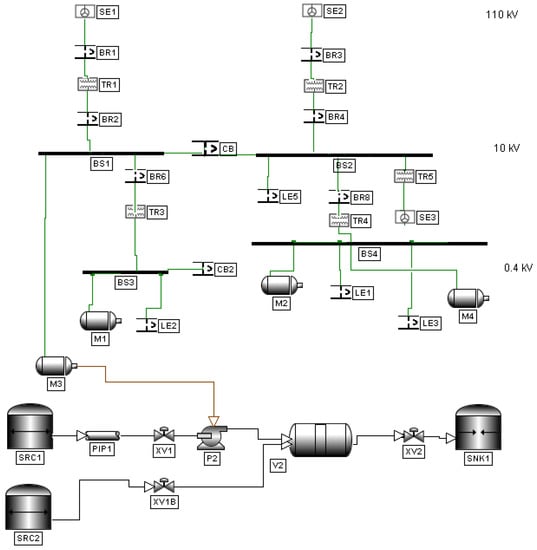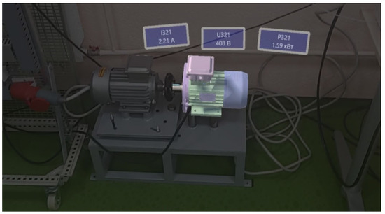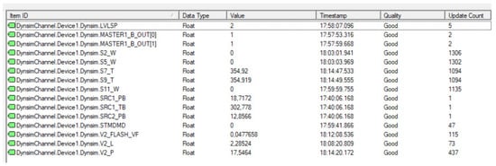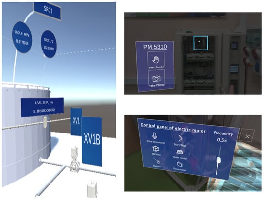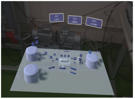 Therefore, we had three parts of laboratory units. The first was a technological process (Figure 3) with pumps, the second was a power system simulation unit containing part of the energy-mechanical equipment: motors for pumps (Figure 4) with the control system and smart shield (Figure 5), which allowed us to connect the pump to the power supply system. On the laboratory unit (Figure 3), the main technological parameters—pressure, flow rate, and temperature at different points—were taken. The dynamic model (Figure 1) represents the co-modeling of the power supply system and the technological process. Some of the equipment was represented in its real form on the laboratory unit. For instance, this included a pump motor with current, voltage, and power sensors and the switches of the smart shield. They allowed for controlling the power supply system. This equipment represented real objects. Partially the same objects and additional other objects were presented in the form of a dynamic model by their 3D models (the images of some parts of the installation as presented in the industry). The full 3D model of the installation is shown in Figure 11. Apart from the 3D view of this installation, the application showed the change of the parameters of the dynamic model in real time. Thus, according to Figure 2, we had a dynamic model of the process and physical models of the process parts. Figure 11 (left) shows the detailed part of the installation in its industrial 3D form. Aside from that, Figure 11 (right) shows the interaction between the user, the augmented reality system (control buttons), the real part of the equipment (laboratory stands that received control signals and changed the physical state of the equipment or the dynamic model), and the virtual part of the equipment (the dynamic model and its detailed 3D image). It should be emphasized that there was a difference between the variables in Figure 1 (dynamic model), Figure 8 (data collection server), and Figure 11. This was due to the fact that Figure 8 shows a list of possible variables of the dynamic model. The names of the tags in it were derived automatically and were defined by the Aveva Dynamic Simulation software manufacturer. Figure 10 and Figure 11 show the variables actually captured in the unit, and their nomenclature corresponds to the nomenclature of the industrial object. There was a difference between the parameters of the dynamic model, the augmented reality application, the parameters of the automation system, the parameters of the energy system, and the parameters accepted as standard in an industrial enterprise. This is a big concern. It is required to use a single standard for forming the variable name. However, currently such standards are not used, and the correlations between the variables are established by means of special linking tables. In this work, the following variables, shown as an example in Figure 8, were removed at the level of the dynamic model: special automation system operation variables (control loop starts (Master 1_B_out)), set point feed for temperature changes, flow (LVLSP) in streams and equipment, pressure (P and PB), temperature (T), flow rate (W) in the raw streams (S2, S5, S7, S9, and S11), in the source (SRC1 and SRC2), in the drum (V2), and in the final reservoirs (SNK1, SNK2). Additionally, the positions of valves XV1, 2, and 3, the status of motors M1, 2, 3, and 4, and other parameters of the power system (e.g., current and power voltage) were taken. Figure 8 shows a sample list of the variables. If necessary, one could display any parameter in the system (for one flow or type of equipment, there were about 100 parameters). The variables shown in Figure 11 for the engine are presented with the name used in production. These names must be clear to the users of the system. Therefore, I321 for the current, U321 for the voltage, and P321 for the power were used. It should be emphasized that these parameters were taken from the laboratory model of the pump shown in Figure 4 with the current, power, and voltage sensors mounted on them. Linking (linking the same and other variable names) was performed in the KEPServer (i.e., in the communication layer) of Figure 2.