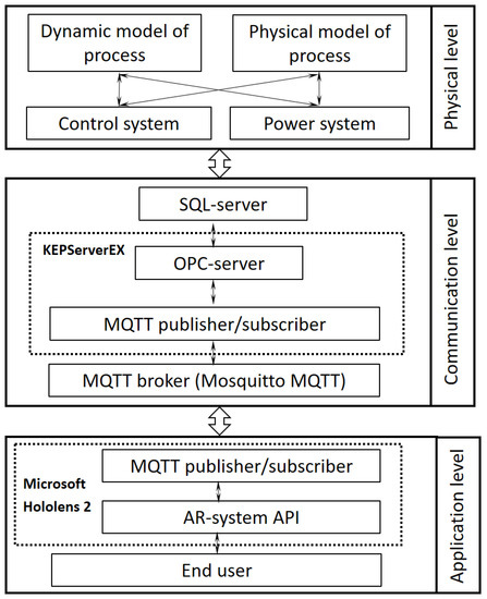 3. The main protocols of the communication module are MQTT and OPC (OPC UA). OPC allows communication between the dynamic model, automation system, and power supply system. Then, the data from the OPC server are published on the MQTT broker, which interacts with the augmented reality application on HoloLens 2 glasses. The SQL server in this structure is a tool to keep a history of all changes at all levels. All values are recorded with corresponding timestamps. For the system to work correctly, all components have to be time-synchronized;